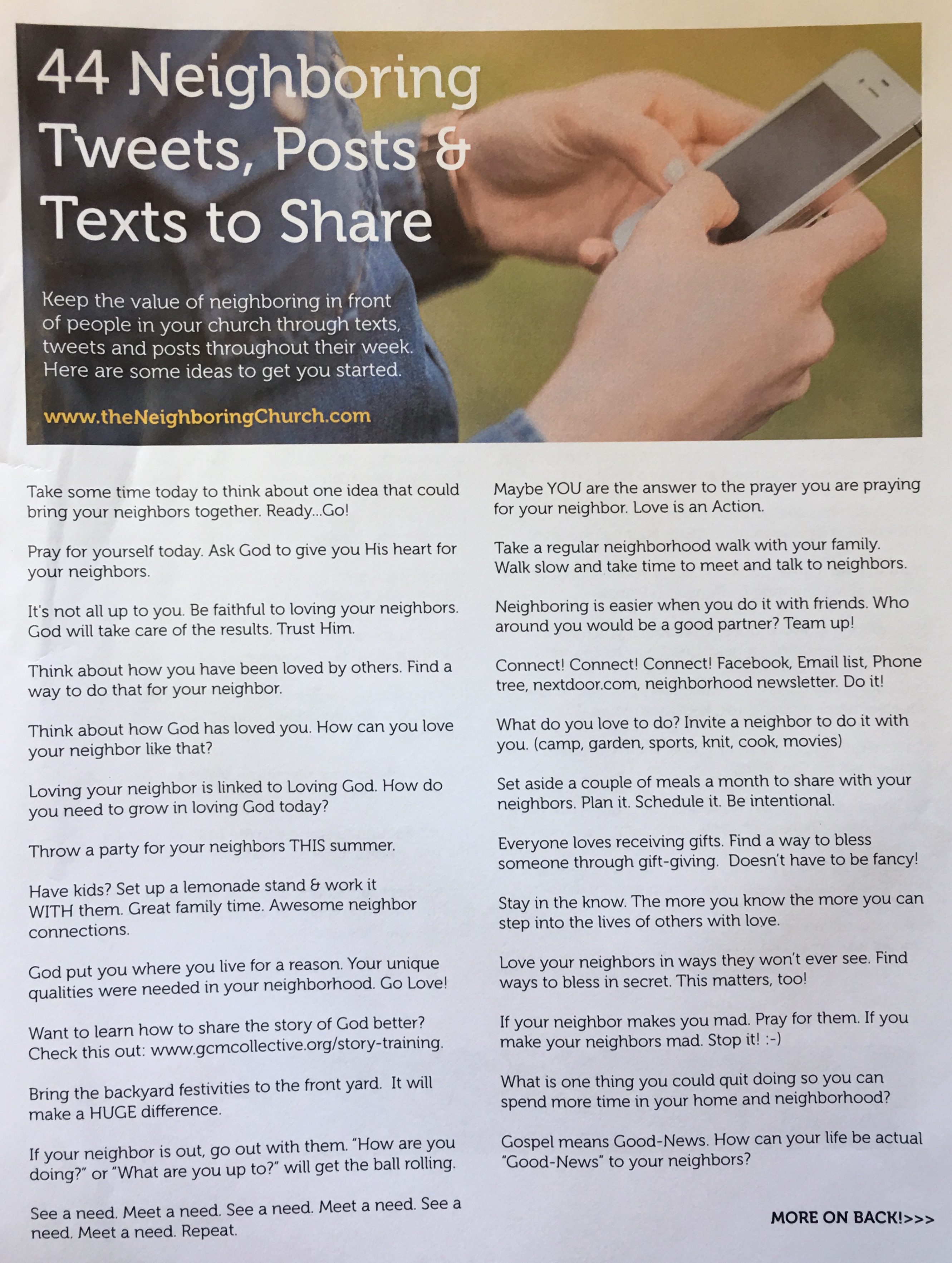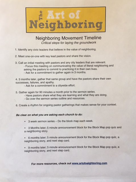- Neighboring is a long game, we must repeat the same message over and over and over and over in our churches