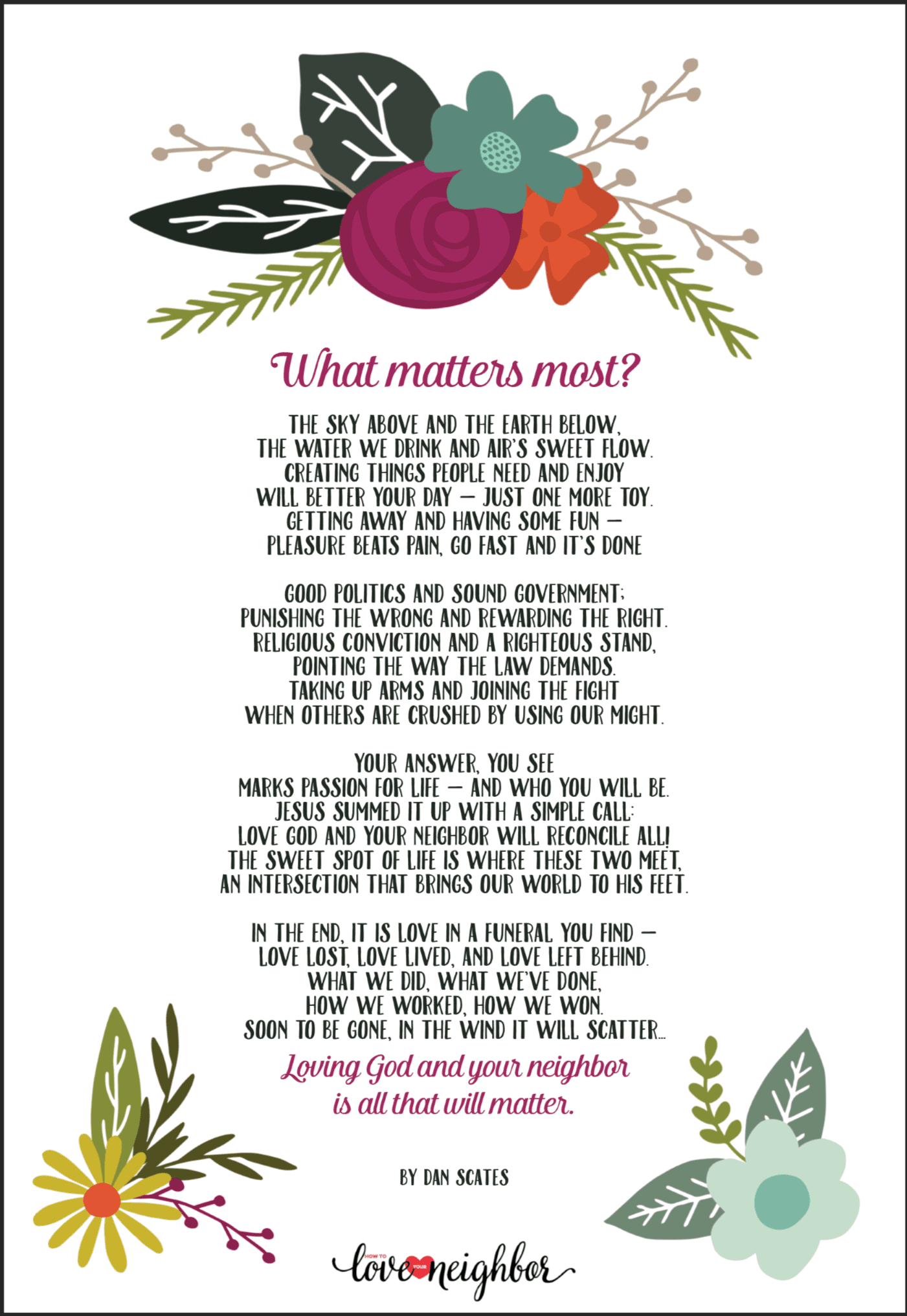 My new friend Dan Scates wrote this beautiful poem about “What Matters Most” after the funeral of a young friend. Dan has the perfect heart to serve as the Coaching and Leadership Development Pastor at LifeBridge Christian Church in Longmont, Colorado.
