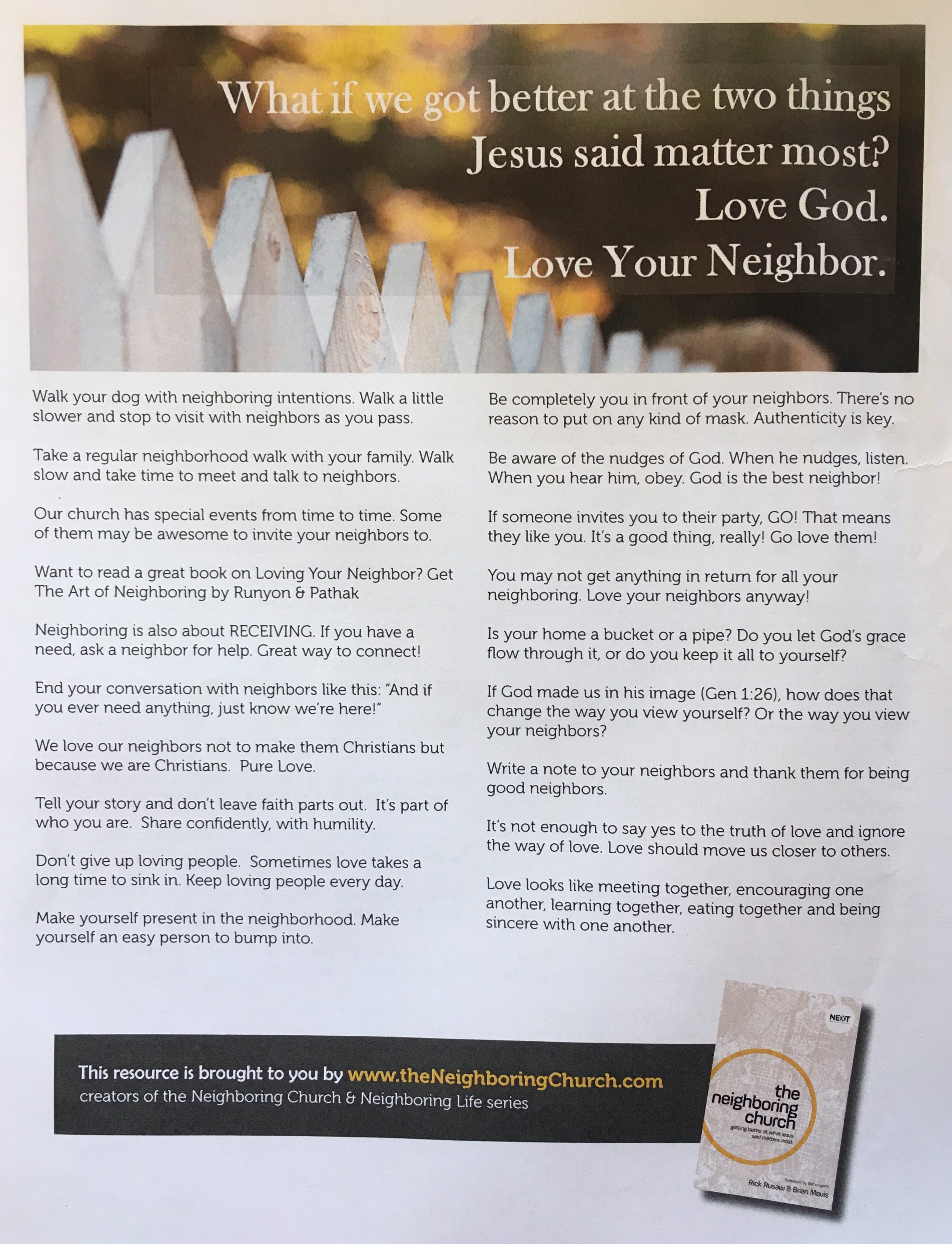 - The Neighboring Church reveals the secret to doing what Jesus says matters most. They are producing a video series to accompany the just-released book. Download 44 neighboring tweets, posts and texts to share! Part 1 | Part 2