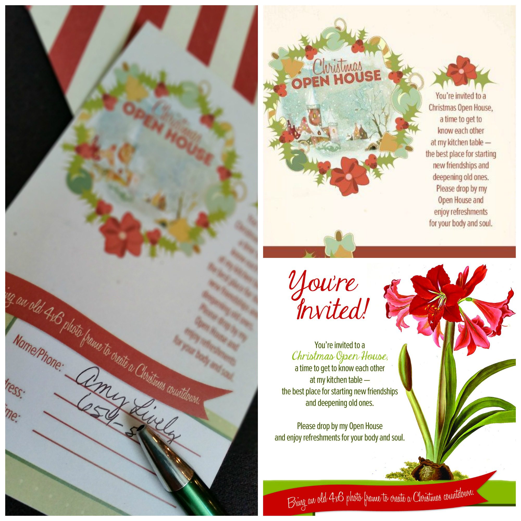 Choose from two designs – a vintage wreath or pretty amaryllis – that gently invite your neighbors to get to know one another over coffee at your kitchen table. If you opt to do the Christmas Countdown Craft at your Open House, you can print an invitation that says, “Bring an old 4×6 photo frame to create a Christmas countdown.” You customize each invitation with your name and contact information as well as the date of your event.